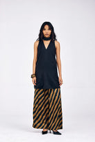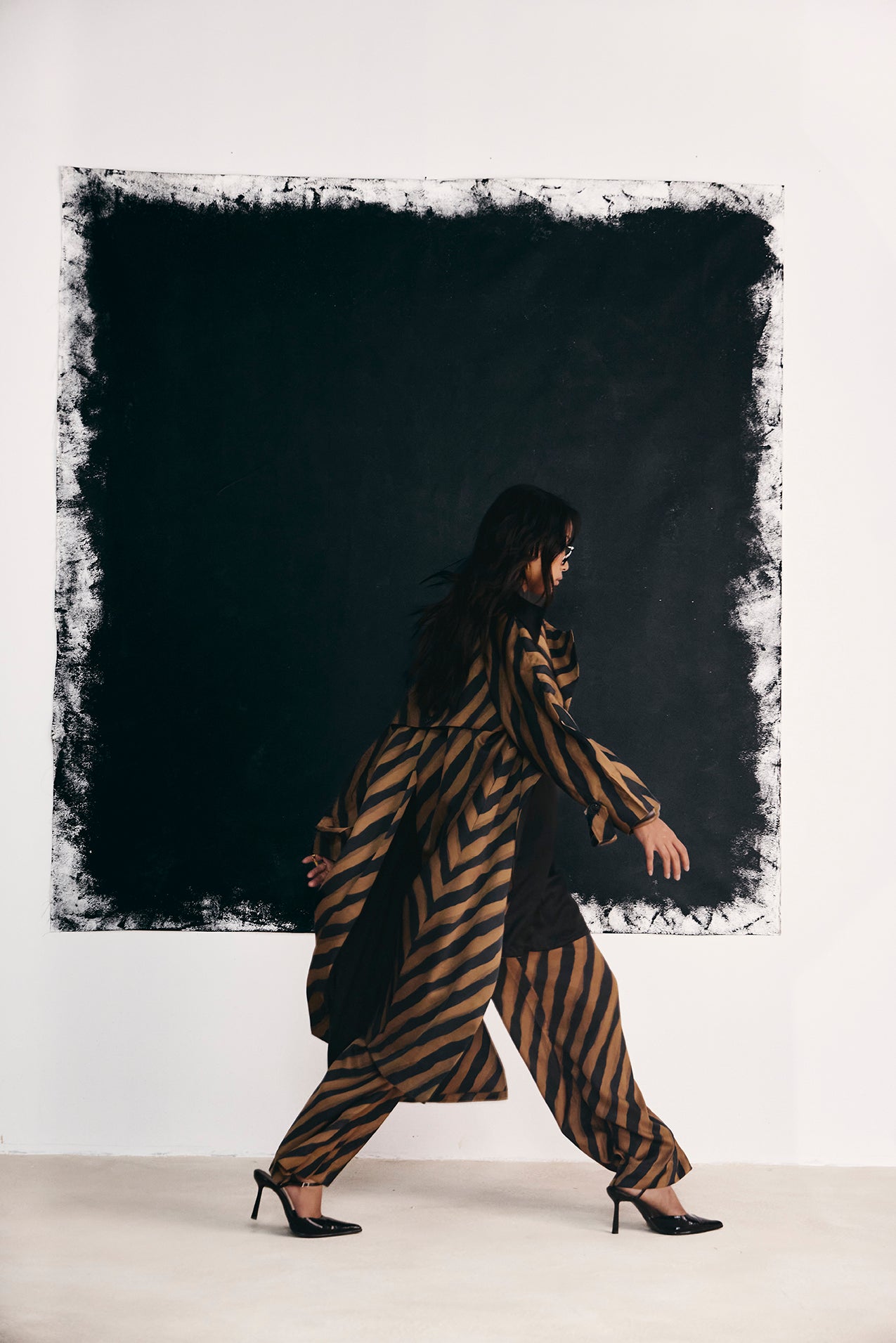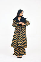 The Verge Co-ord set features a Long Trench Jacket, V-neck mini dress paired with relaxed-fit chevron print pants, With its wide-legged silhouette and subtle sheen, the set blends structure with fluidity, perfect for transitional dressing that takes you from day to night.