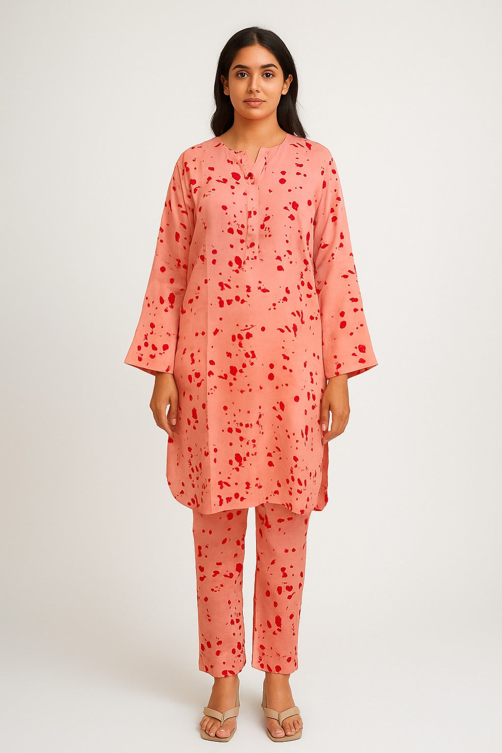 Introducing Tarini kurta Set with ankle length pant, an easy relaxed fit 2 piece ensemble set. kurta : printed kurta with band collor with open placket in the front Trouser: Straight fit printed trouser with front opening & elastic at the back. Has cross pockets on the sides.