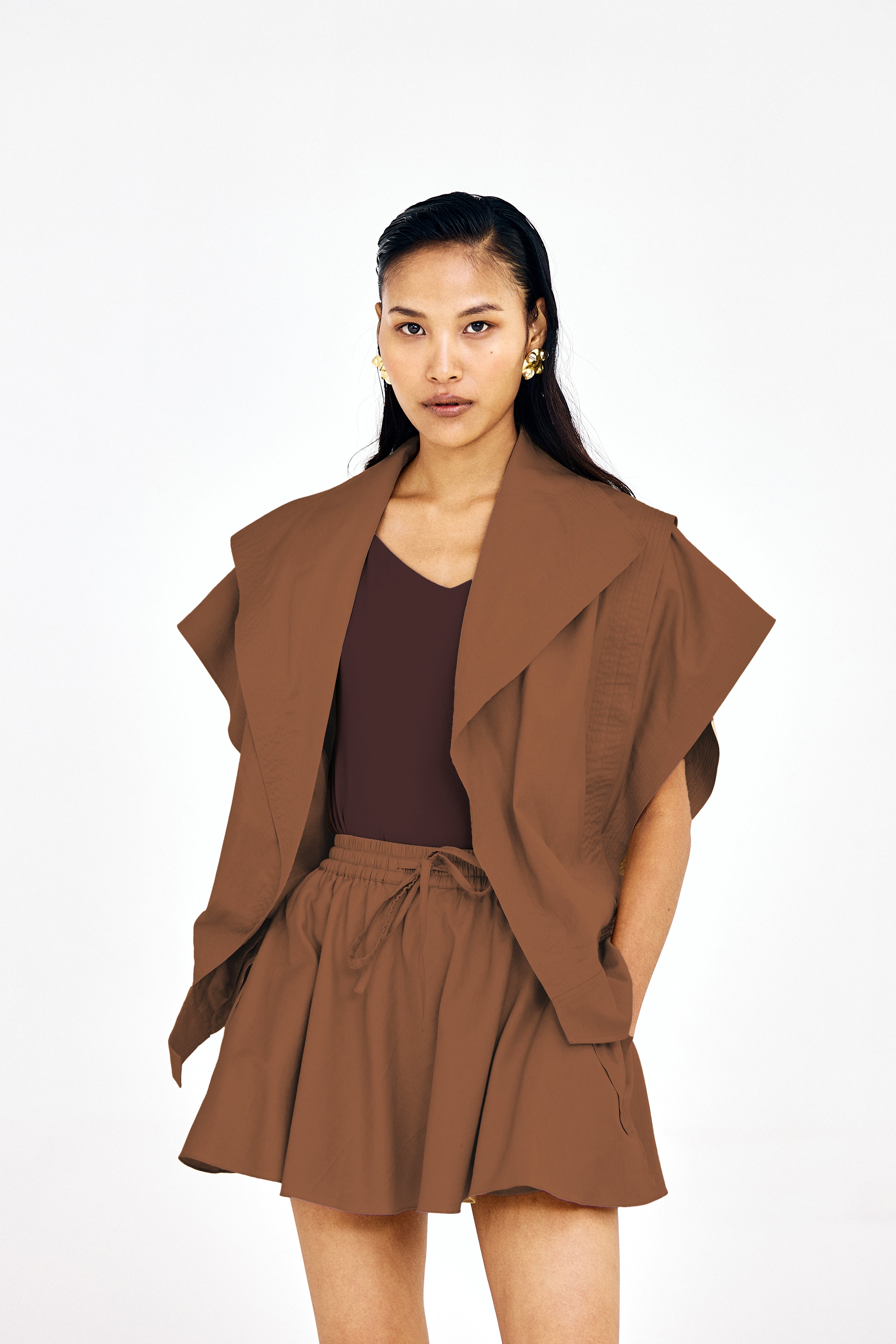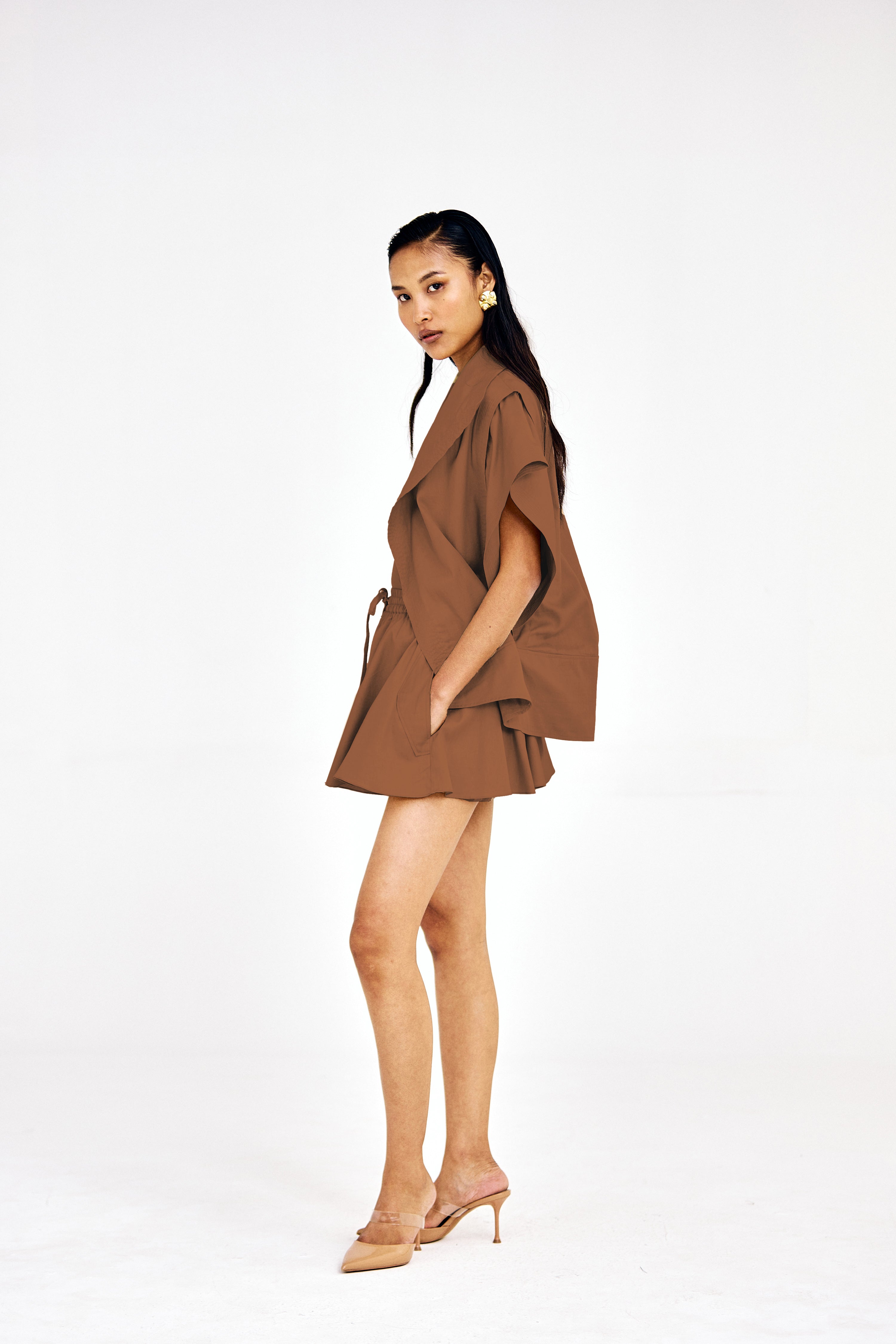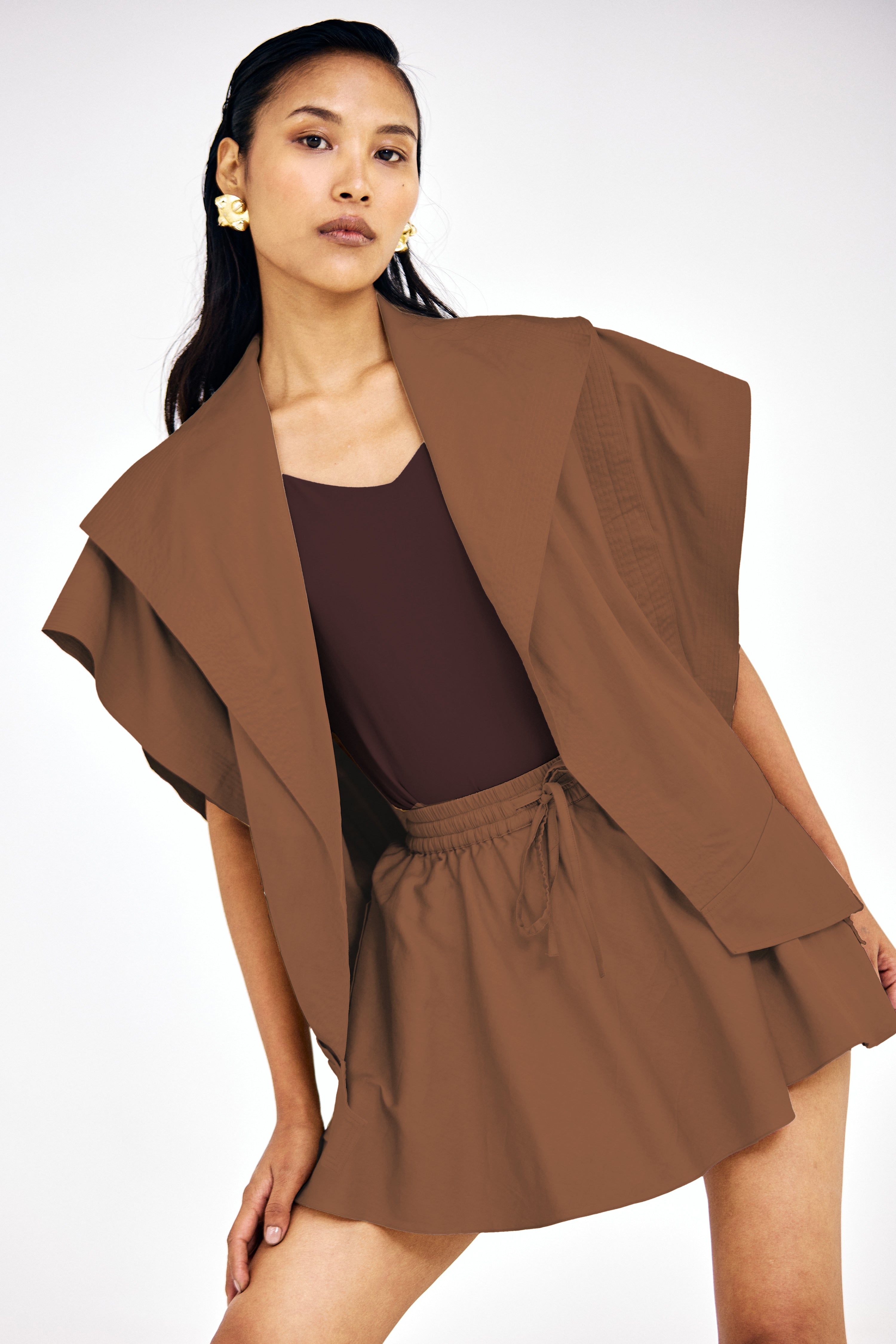 The brown Co-ord Set features a short asymmetrical jacket crafted in cotton twill, paired with a matching mini skirt. The skirt has a relaxed fit with subtle waist detailing, creating a coordinated and modern look. Together, the set strikes the right balance between structure and ease, perfect for days you want to keep it polished yet playful.