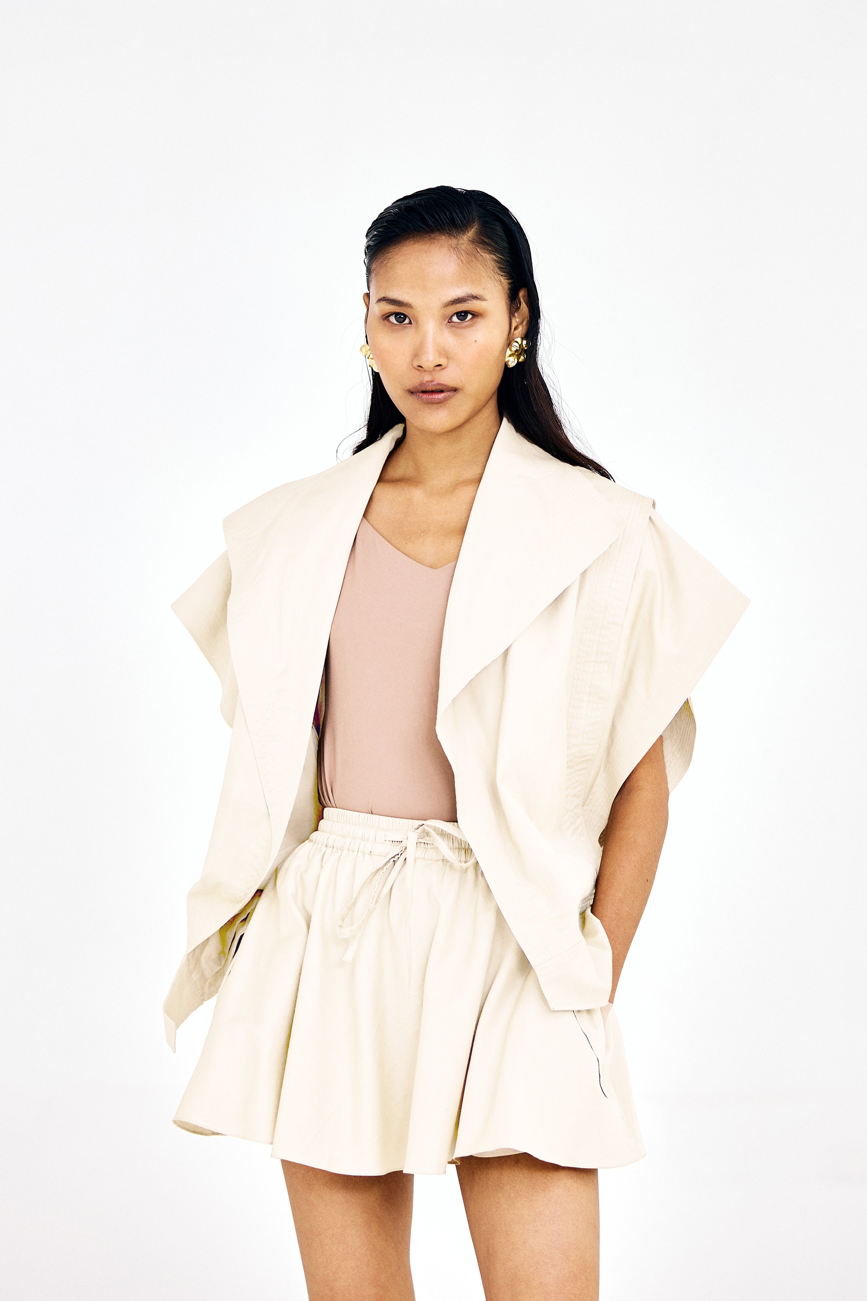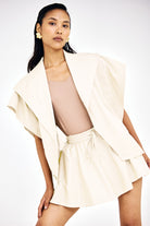 The ivory Co-ord Set features a short asymmetrical jacket crafted in cotton twill, paired with a matching mini skirt. The skirt has a relaxed fit with subtle waist detailing, creating a coordinated and modern look. Together, the set strikes the right balance between structure and ease, perfect for days you want to keep it polished yet playful.