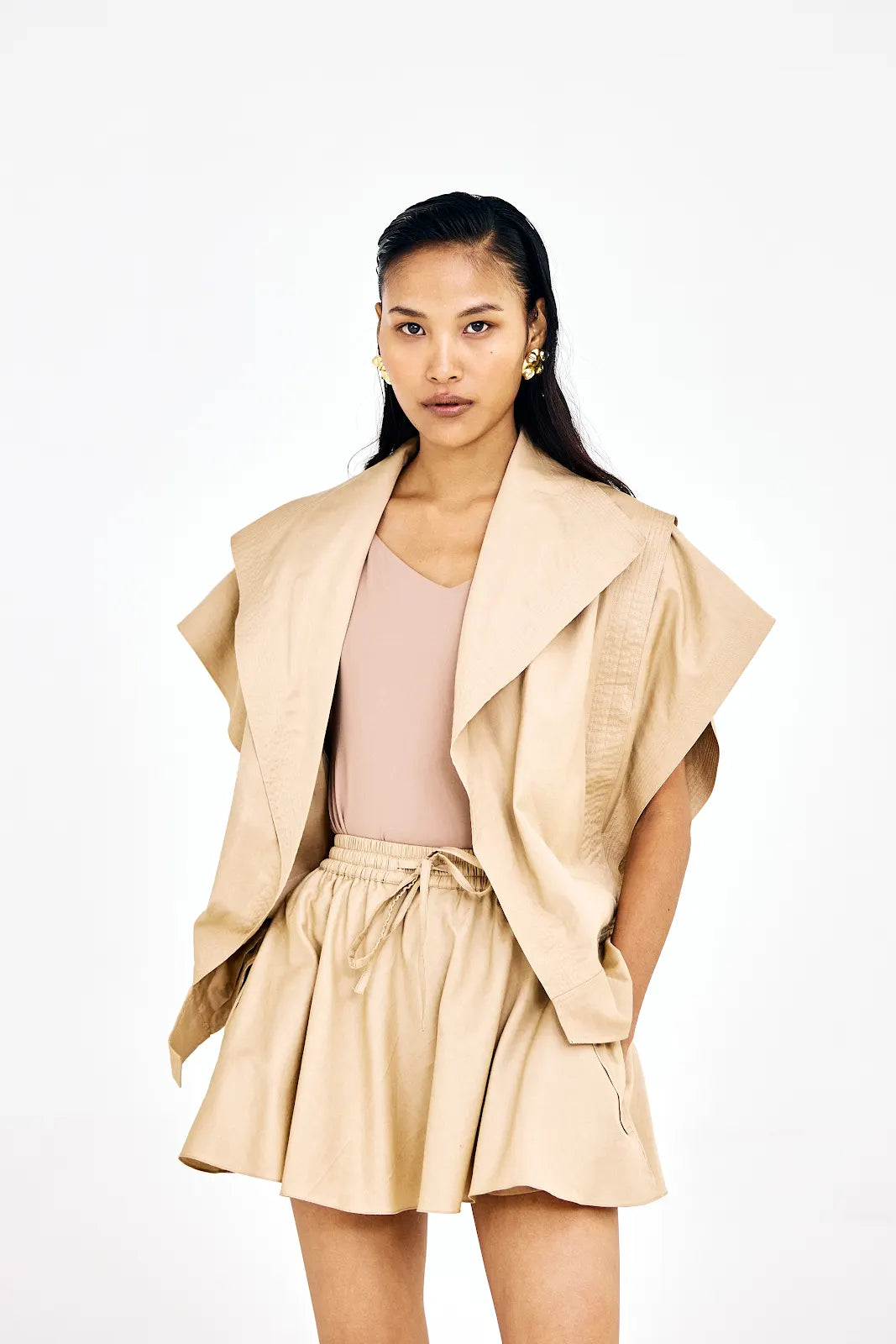 This beige mini skirt is crafted in cotton twill and features a relaxed fit with subtle waist detailing for added comfort. The skirt comes with attached shorts inside, making it easy and comfortable to wear. Its makes for a versatile piece that can be styled with everyday tops or paired with the matching asymmetrical jacket for a coordinated look.