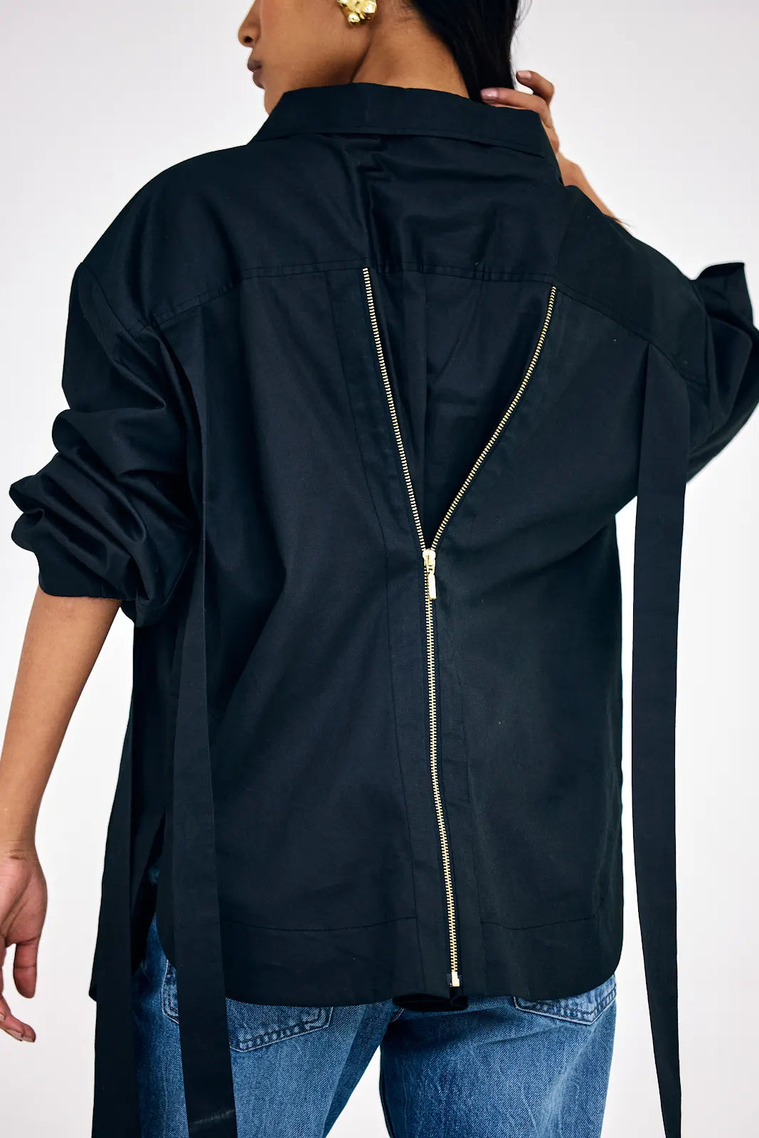 This Shirt features a layered front design with a sleek finish, complemented by unique zipper detailing at the back for an edgy touch. Its lightweight structure and contemporary silhouette that can also be wored as a jacket make it a versatile and stylish choice.