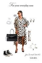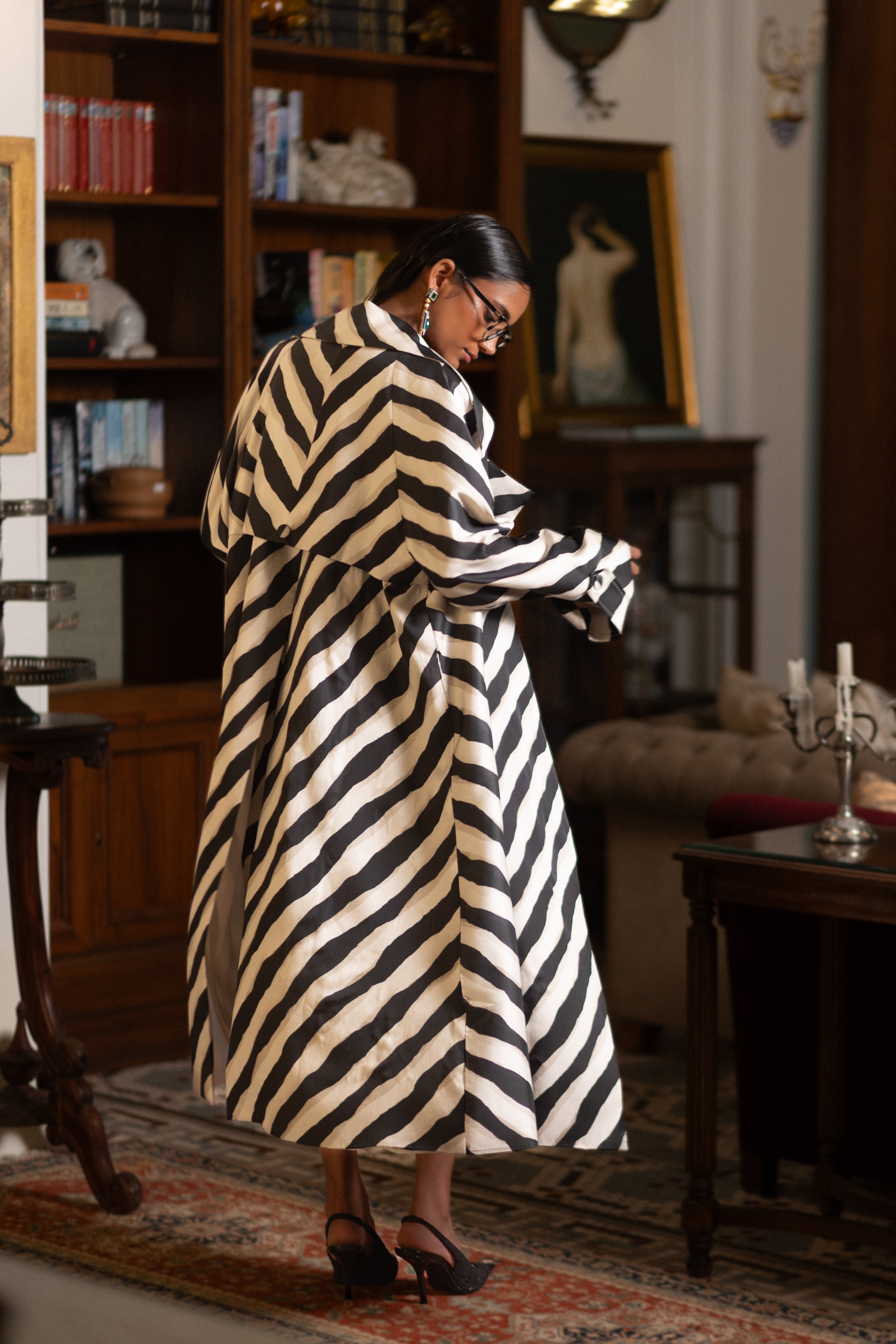The striped pattern brings a bold, artistic touch, while sharp shoulders balance the soft, flowing silhouette.