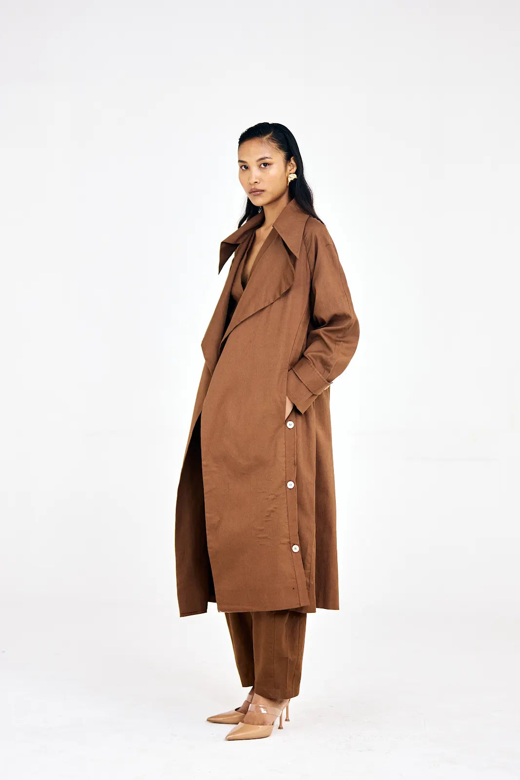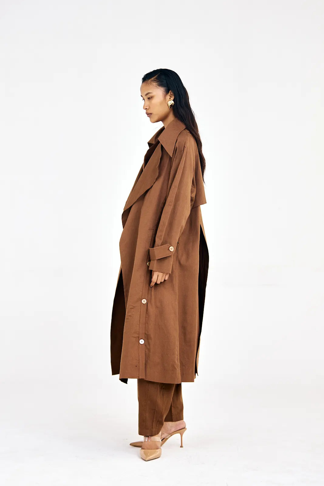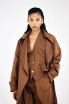 Crafted in lightweight cotton twill, this set features relaxed barrel pants with side pockets, a waist-cinching button-down waistcoat, and a classic Noria trench coat with an elongated lapel and sharp tailored silhouette. Wear the set together for a cohesive, elevated fall look, or mix and match the pieces individually for versatile styling across your wardrobe.