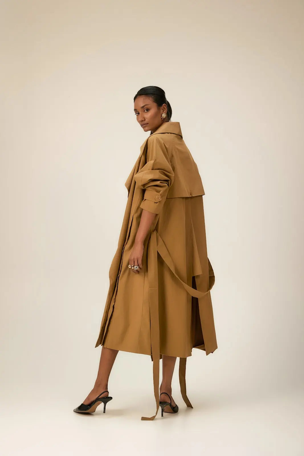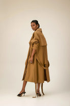 The design includes long sleeves with adjustable cuffs and a flowy hem, combining classic structure with modern elegance. Perfect for layering and versatile styling